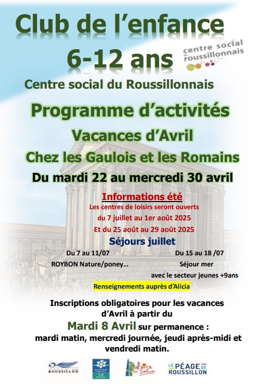 Le Service ALSH Club de l’enfance du Centre Social Roussillonnais invite les enfants de 6 à 12 ans à vivre des vacances d’avril inoubliables avec un thème captivant : « Chez les Gaulois et les Romains » ! Du mardi 22 au mercredi 30 avril, les jeunes aventuriers plongeront au cœur de l’Antiquité pour découvrir les secrets de ces civilisations fascinantes.