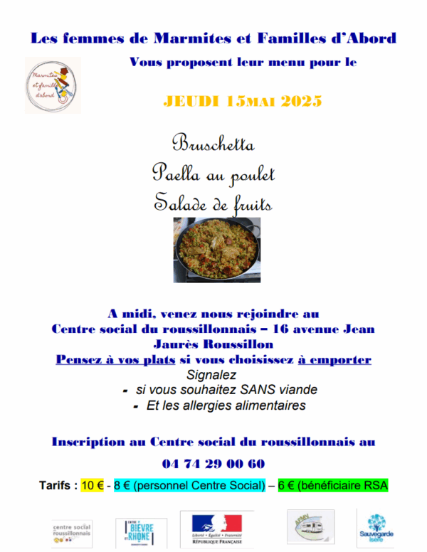 Notez bien la date dans vos agendas : le Jeudi 15 Mai 2025 à midi, au Centre Social du Roussillonnais.