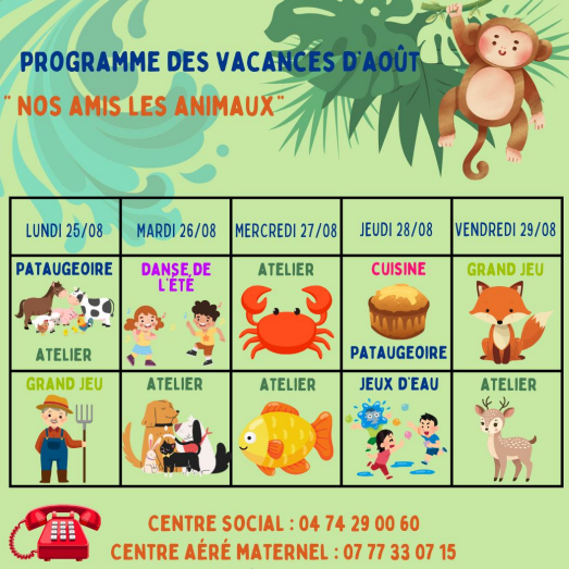 - Vendredi 29 août : La semaine se termine en apothéose avec un grand jeu sur le thème des animaux de la forêt et un dernier atelier pour créer un souvenir de la semaine.
