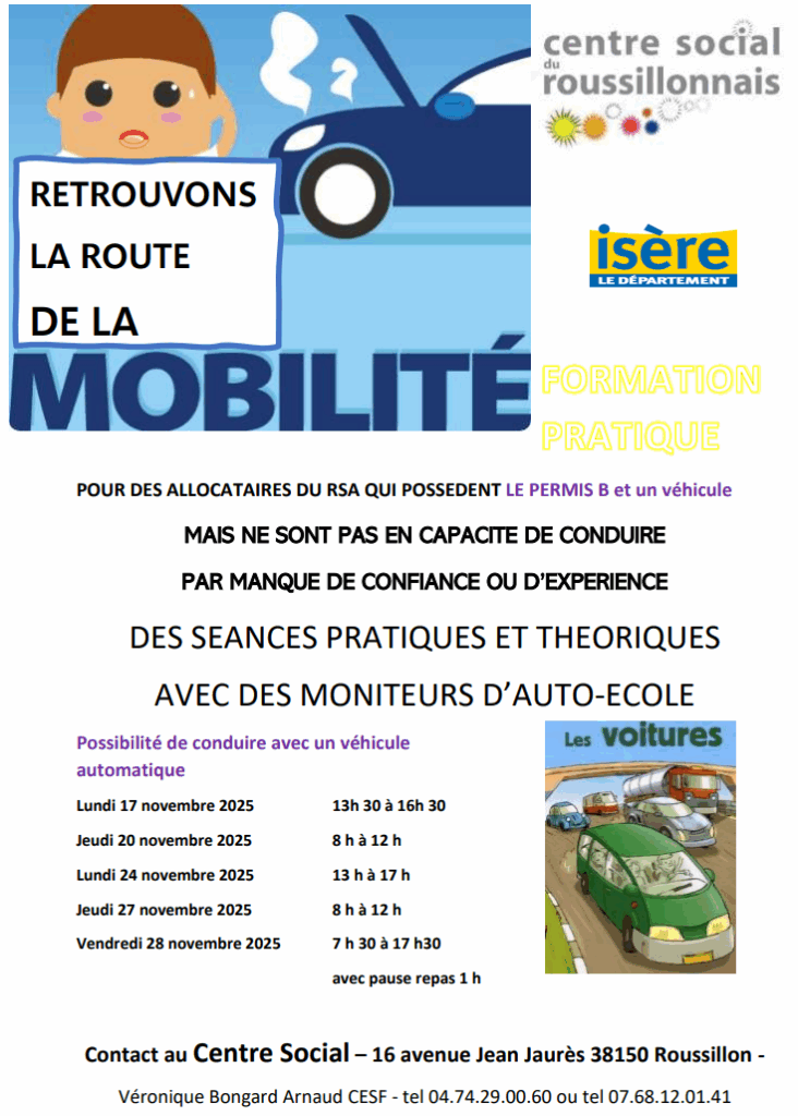 Au Centre Social du Roussillonnais, nous sommes convaincus que la mobilité est une clé essentielle de l’épanouissement et de l’insertion. C’est pourquoi, main dans la main avec notre partenaire, le Département de l’Isère, nous avons mis en place l’action « Retrouvons la route de la mobilité ». Plus qu’une simple formation, c’est un véritable tremplin que nous vous proposons de construire avec vous.