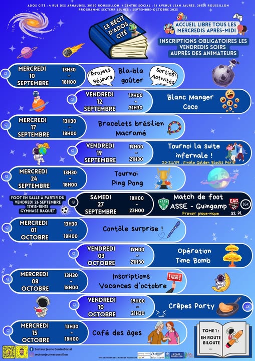 La rentrée est là, et avec elle, une nouvelle saison d’aventures, de rencontres et de projets qui s’ouvre à nous ! Au Centre Social et Culturel du Roussillonnais, nous sommes convaincus que chaque jeune a un talent à exprimer, une idée à partager et une énergie à déployer. C’est pourquoi le Secteur Jeunesse lance son programme de septembre-octobre, « Le Récit d’Ados Cité », une véritable invitation à co-construire des moments inoubliables.