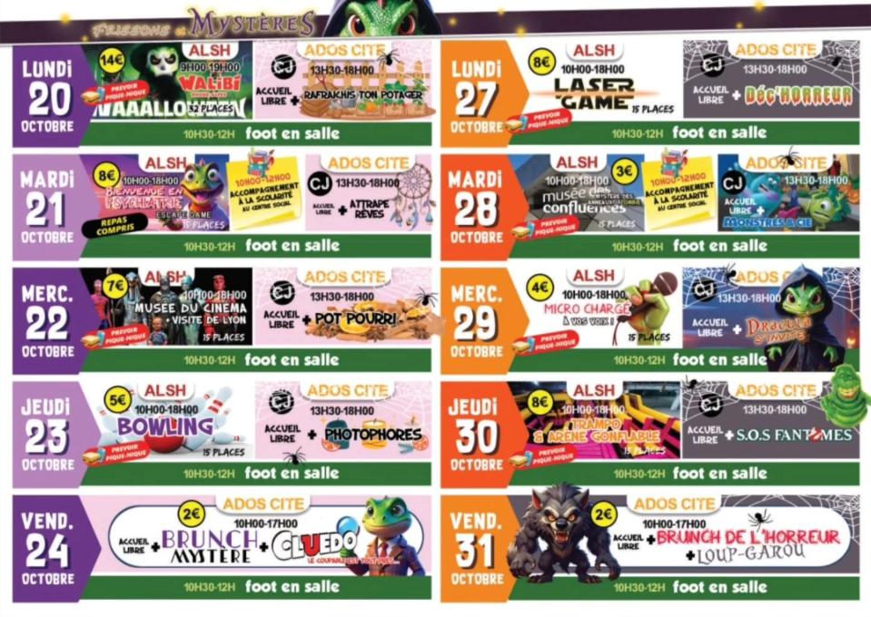 L’automne s’installe, les feuilles craquent sous nos pas et une ambiance mystérieuse commence à planer… C’est le moment parfait pour se retrouver ! Pour les vacances de la Toussaint, du 20 au 31 octobre, nous avons concocté pour les jeunes de 11 à 17 ans un programme qui promet des moments inoubliables : « Frissons et Mystères ».