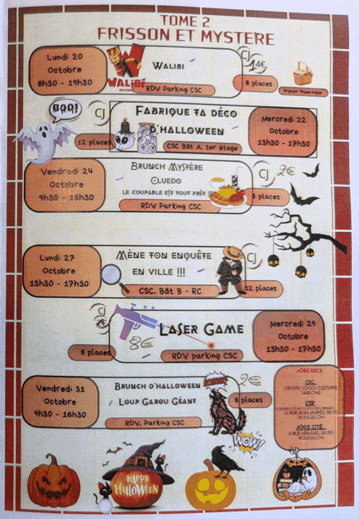 L’automne s’installe, les feuilles rougissent et une ambiance de mystère flotte dans l’air… C’est le moment parfait pour se retrouver ! Pour les vacances d’octobre, nous avons concocté un programme spécial « Frisson et Mystère » pour tous les jeunes de 11 à 17 ans du Roussillonnais. Loin de la routine des cours, c’est une invitation à partager des moments forts, à résoudre des énigmes et à vivre des aventures palpitantes. Ensemble, faisons de ces vacances un souvenir inoubliable !