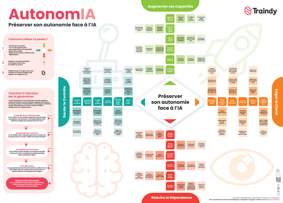 Pour nous aider à relever ce défi, l’affiche « AutonomIA » est un outil visuel simple et parfait à afficher sur le frigo. Elle propose 4 grands défis, ou « piliers », pour muscler notre autonomie numérique :