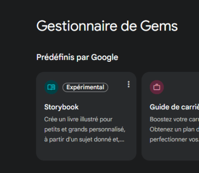 - Le robot Gem Storybook que vous retrouverez dans les Gems « prédéfinis par Google » de votre interface Gémini (voir illustration ci-dessus)