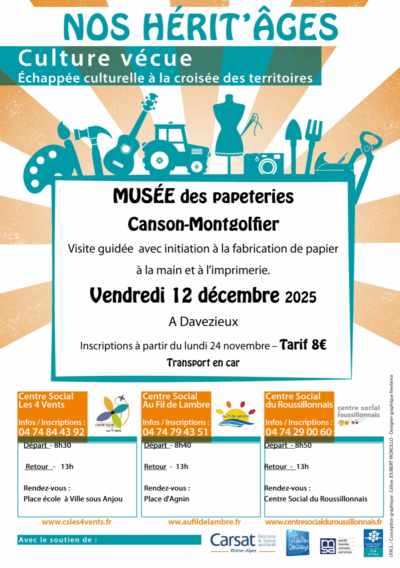 C’est avec un immense plaisir que nous vous invitons à une nouvelle « échappée culturelle » réservée au plus de 60 ans, un moment privilégié où l’histoire locale et le faire-ensemble se rencontrent. Le vendredi 12 décembre prochain, nous mettrons le cap sur Davezieux pour une matinée d’exception au Musée des Papeteries Canson-Montgolfier.