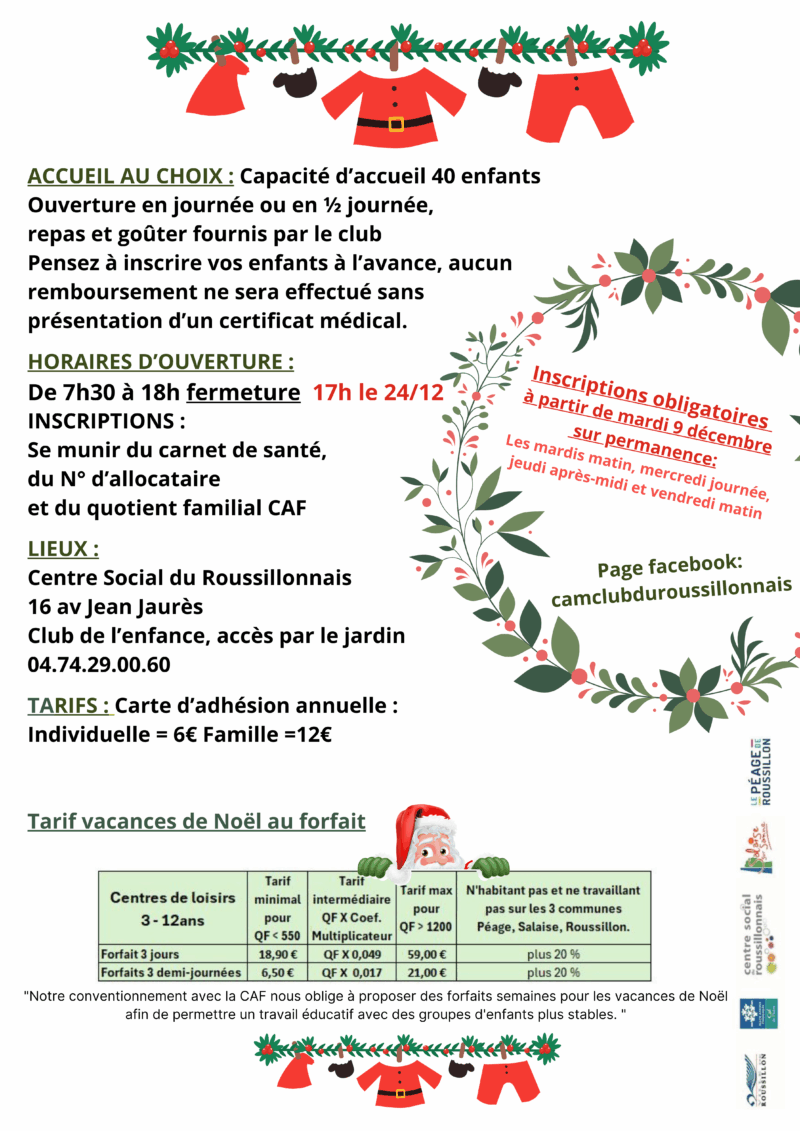 Informations pratiques pour les parents Nous vous rappelons que pour permettre à chacun – enfants comme équipe d’animation – de préparer son réveillon en famille, le centre fermera exceptionnellement ses portes à 17h le mercredi 24 décembre.