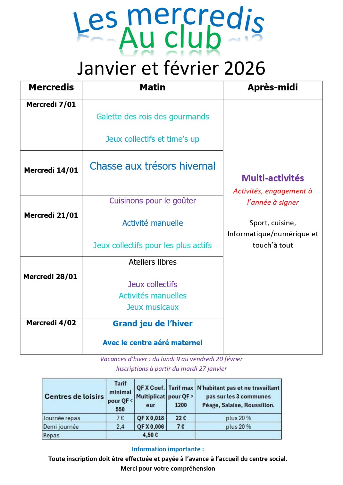 Nous vous rappelons que toute inscription doit être effectuée et réglée à l’avance à l’accueil du centre social. Concernant les vacances d’hiver (du 9 au 20 février), préparez-vous : les inscriptions ouvriront le mardi 27 janvier.
