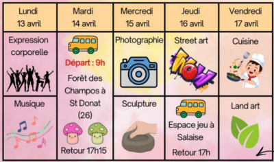 La deuxième semaine des vacances d’avril 2026 ne sera pas en reste avec de l’expression corporelle, de la musique et une grande journée d’exploration en forêt à Saint-Donat.