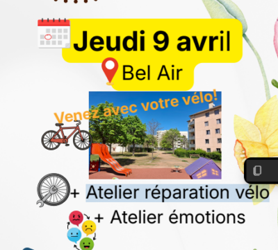 - Un atelier mécanique vélo animé par l’AGEDEN dans le cadre du programme Vélos-égaux : Apprendre à vérifier l’état de son vélo : sur votre vélo ou sur celui en démo, on vérifie les point clés pour pédaler en sécurité. Apprendre à réparer une crevaison : des roues de vélos pour s’entraîner et les crevaisons n’auront plus de secret.