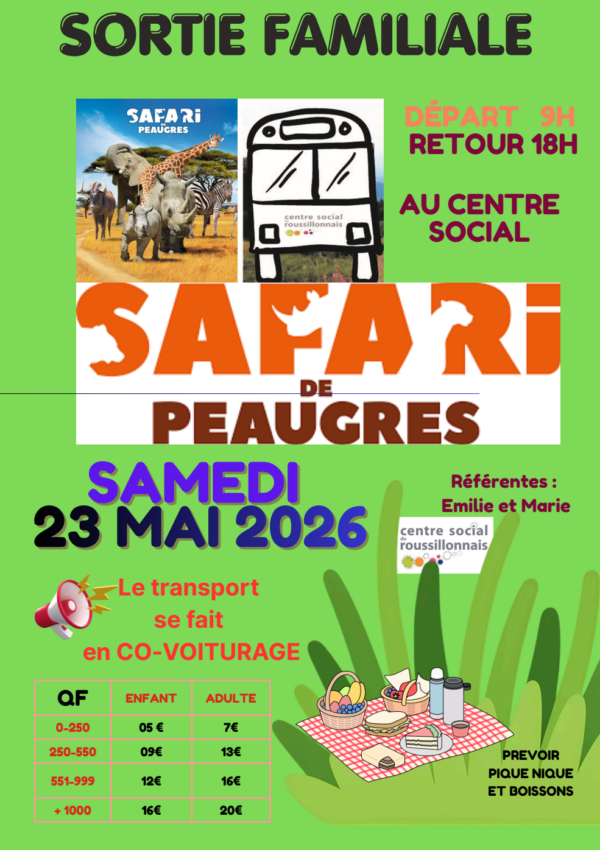 Le printemps est là, et avec lui, l’envie de nous évader et de partager des moments forts ensemble. Le samedi 23 mai 2026, nous vous proposons de troquer le paysage urbain contre les plaines sauvages du Safari de Peaugres. Cette journée, pensée par et pour les familles de notre territoire, est une invitation à l’émerveillement et à la convivialité.