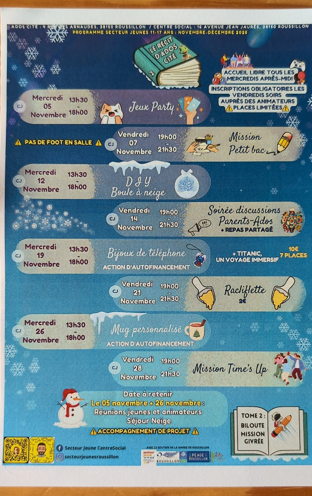 L'année touche à sa fin, mais à l'Ados Cité, l'aventure continue de plus belle ! Le mois de décembre 2025 s'annonce riche en émotions, en créativité et en partages, toujours sous le signe de notre "Mission Givrée", le deuxième tome de "Le Récit d'Ados Cité". Décembre à l'Ados Cité : La Mission Givrée s'intensifie avec